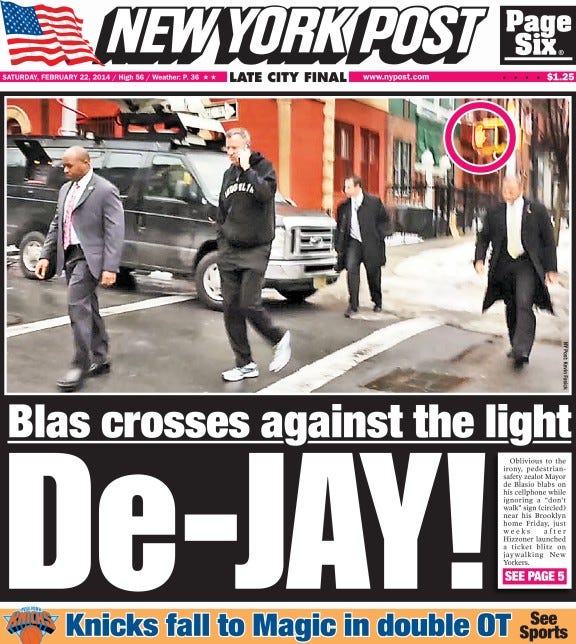 The first story, broken by CBS News, follows de Blasio’s mayoral caravan through numerous red lights. The headline, “De Blasio’s Caravan Caught Speeding, Violating Traffic Laws Embarrassment Comes Just Days After Mayor Announced New Traffic Safety Initiative,” blared charges of hypocrisy. But de Blasio, of course, didn’t drive his own car—the NYPD did. The next day, the New York Post posted a story about de Blasio supposedly jaywalking. The headline, “De Blasio jaywalks as he preaches road safety,” is a perfect viral story of elite law-breaking and double standards. In the story, de Blasio mentions that he was following his security detail’s orders of when and where to go, which the Post scoffs at. But the specifics aren’t important; the point is to make de Blasio look like an aloof hypocrite. In these two stories, the NYPD violates traffic laws, but somehow the blame is put in de Blasio with the NYPD winking along.