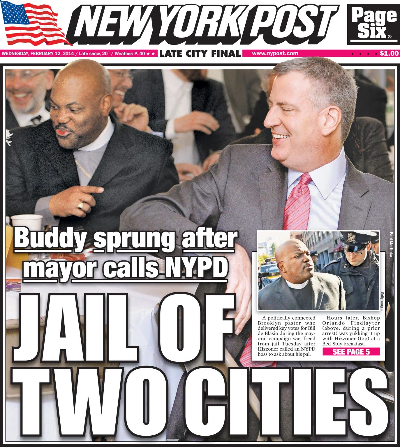 February 11, 2014: New York Post reports that de Blasio intervened to get a friend and political ally, Bishop Orlando Findlayter, out of jail early after he was arrested on warrants stemming from an arrest at a protest. The report cites a “police source,” and also quotes the NYPD police union spokesperson expressing outrage at the incident. This information almost certainly was leaked by elements within the NYPD who were privy to the overnight detaining of Findlayter.
