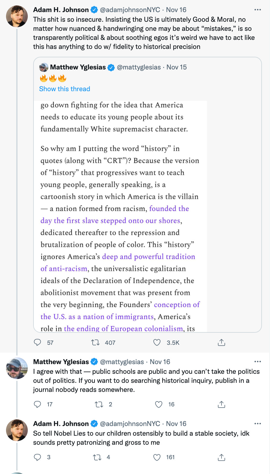 Liberal responses to this, namely from prominent writers Matt Yglesias and Noah Smith, understand this basic premise of American “goodness,” and their political project is to simply tell a more “inclusive” version of this City On a Hill narrative, to posthumously conscript all progressive, anti-colonial, indigenous, radical traditions and people—presumably even those who explicitly considered their ideology anti-nationalist or even anti-American—into some essential American project. In a November 15 Substack post, Smith mocks the “version of ‘history’ that progressives want to teach young people” as a “cartoonish story in which America is the villain.” Ignoring, he argues “America’s deep and powerful tradition of anti-racism, the universalistic egalitarian ideals of the Declaration of Independence, the abolitionist movements that was present from the very beginning, the Founders’ conception of the U.S. as a nation of immigrants, America’s role in the ending of European colonialism.”