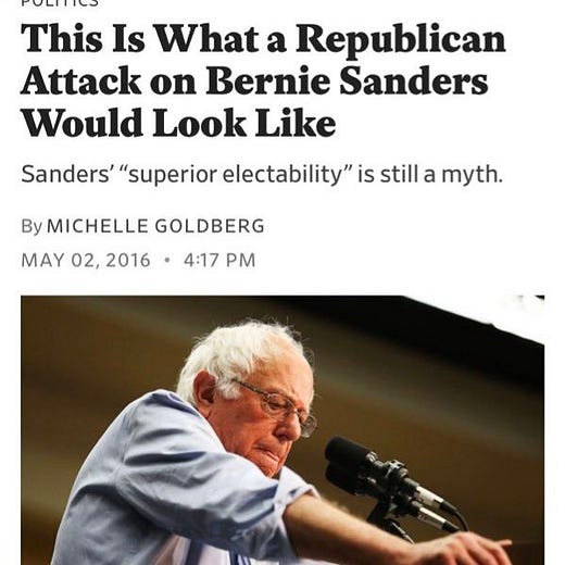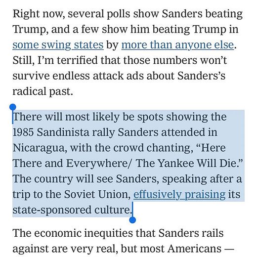 This is all especially grating to see from Michelle Goldberg, who achieved her coveted perch at The New York Times, in part by serving as the anti-Sanders laundromat for the Clinton primary campaign in 2016, running Red Scare oppo at Slate under the thin auspices of Deep Concerns About Potential GOP attacks. A role she dutifully performed again for the centrist wing of the Party in 2020 while at The Times, even rehashing the exact same “Sandinista” line that no one cared about four years prior:
