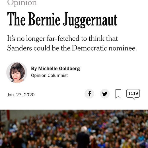 Right when the progressive wing of the Party was beginning to coalesce around Sanders in February 2020, Goldberg explicitly lobbied for Sen. Elizabeth Warren in the New York Times, which she’s well within her right to do. But when she casually disclosed midway through her column that her husband did paid consulting for the Warren campaign, it seems as if this endorsement, belated as it was, was consistent with a pattern of unglamorous Party hackery and left-discipling.