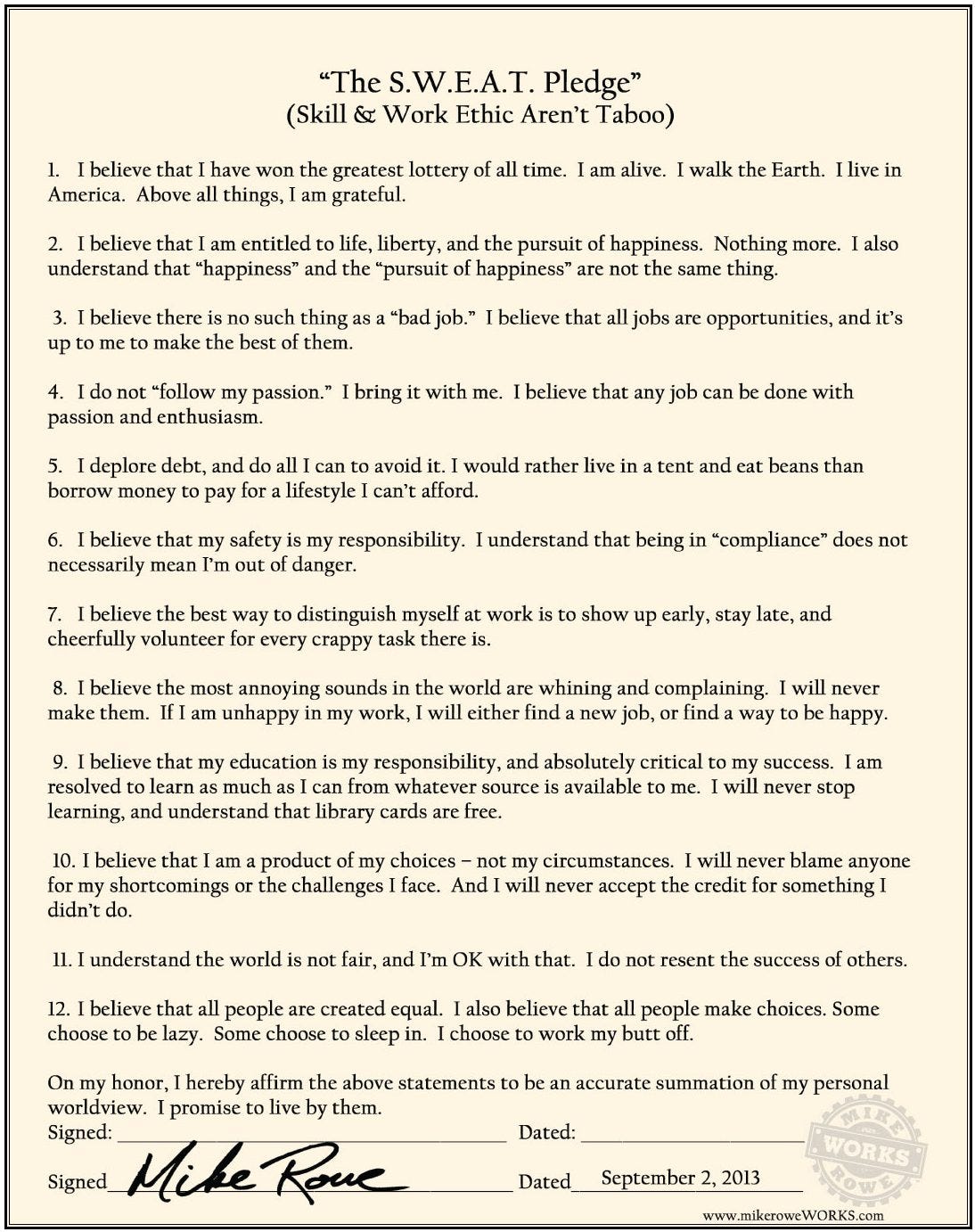 This is central to all of Rowe’s media output: lots of vague and noncommittal cultural solidarity but no class or material solidarity. He respects the aesthetic and the pride and abstractions of “working,” but has absolutely nothing to say about class solidarity among the workers, demands of better safety, or—god forbid—higher pay. Rowe’s most infamous anti-worker writ in this vein was his 2013 “SWEAT Pledge,” a brilliant piece of bourgeois propaganda, whose horror has to be read in its eternity: