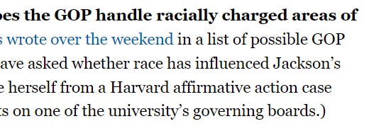 The ABC News article vaguely hints at race-baiting, but never names it, with a somewhat disjointed headline that reads, “GOP uses Jackson hearing to inflame tensions over race, crime.” What they really mean is, “GOP uses Jackson hearing to be racist to Jackson.”