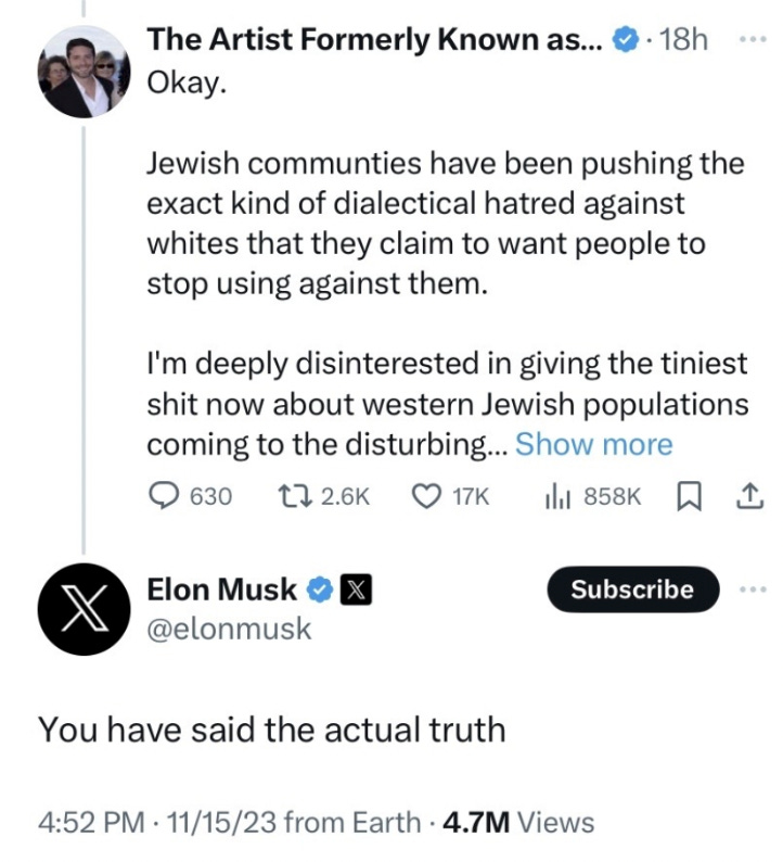 In 2023, Musk replied to an antisemitic account endorsing Great Replacement Theory and blaming “Jewish communities” for conspiring “against whites” by saying “this is the actual truth.” This garnered brief but limited backlash.