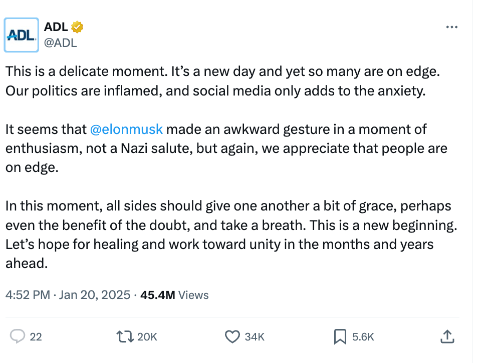 Since then, the ADL has pulled its punches and avoided criticism of Musk, culminating in its now-infamous downplaying of Musk’s clear-as-day Nazi salute during Trump’s inauguration this past January.